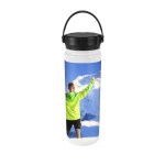 The 12 oz water bottle is made highly durable, with an easy open black plastic lid. The white exterior finish with a sublimation coating allows for vibrant image reproduction.